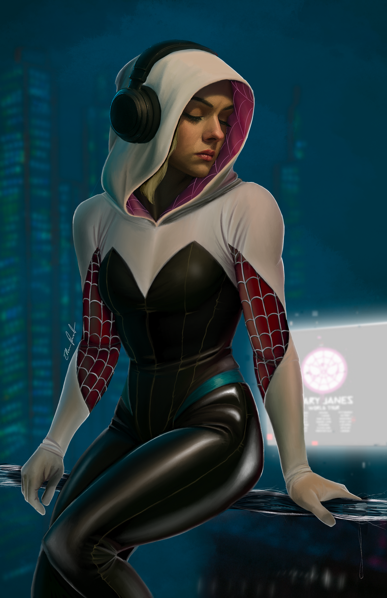 This digital painting of Spider-Gwen captures a quiet, emotional moment as she sits suspended in her web, overlooking the city below. Caught between duty and doubt, she appears deep in thought, perhaps questioning her choices, or longing for home. This listing is for an 11x17 signed, unframed print of the original digital artwork.